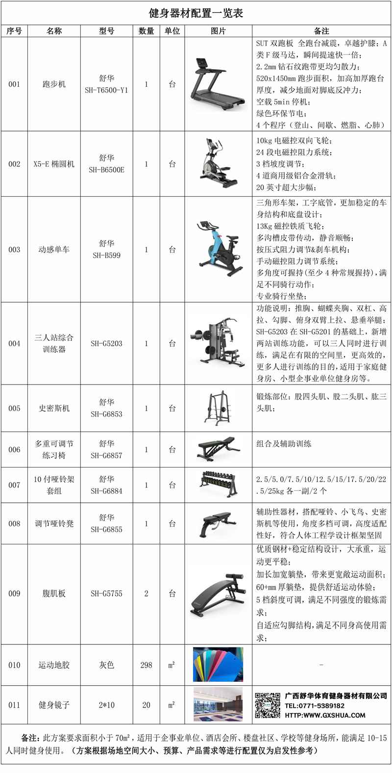 此方案要求面积小于70m²,适用于企事业单位、酒店会所、楼盘社区、学校等健身场所,能满足10-15人同时健身使用。(方案根据场地空间大小、预算、产品需求等进行配置仅为启发性参考)