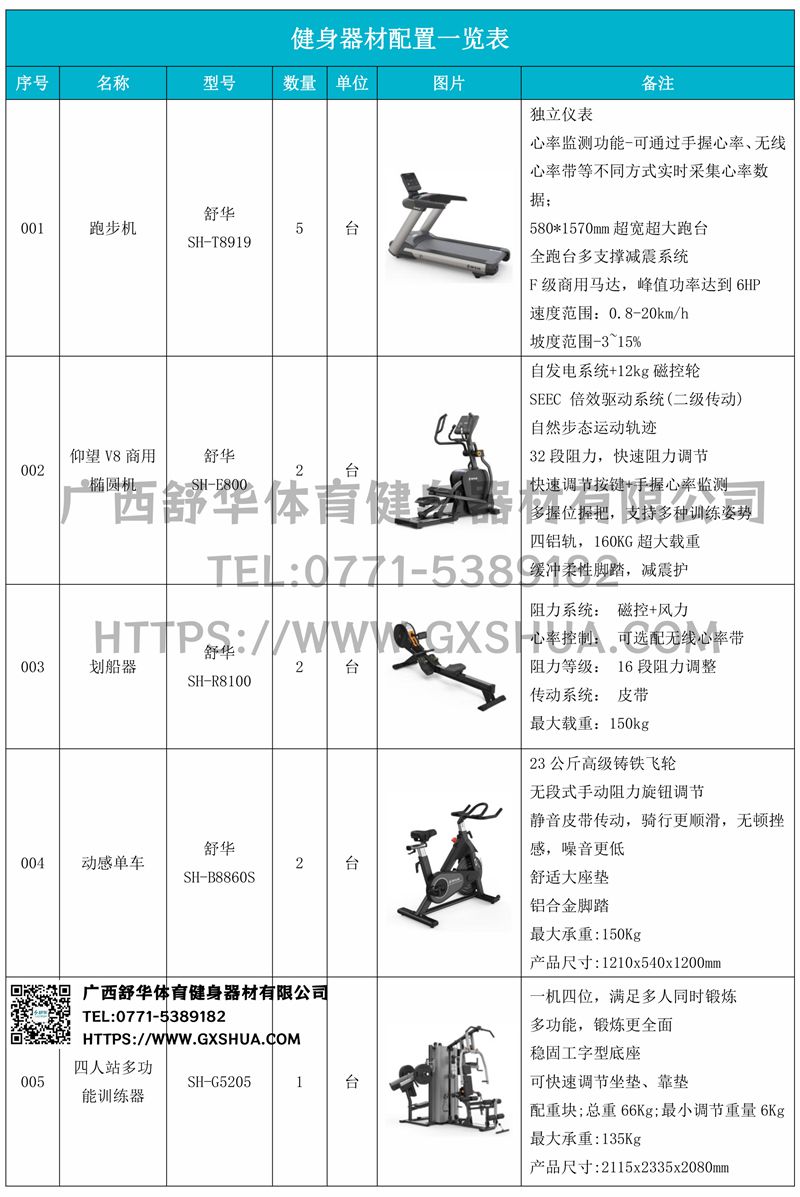 1.好博V9跑步机SH-T8919*5台-580*1570mm超宽超大跑台-跑感舒适,跑台整体安全稳定;全跑台多支撑减震平台,保证跑台超强支撑力,达到180kg支撑,满足专业健身房需求。F级商用马达-超强马达,AC 3.0HP 交流,峰值功率达到6HP,F级商用品质。速度范围达到0.8-20km/h;V9跑步机可实现跑台扬升功能,坡度范围-3~15%,满足客户不同的锻炼需求。