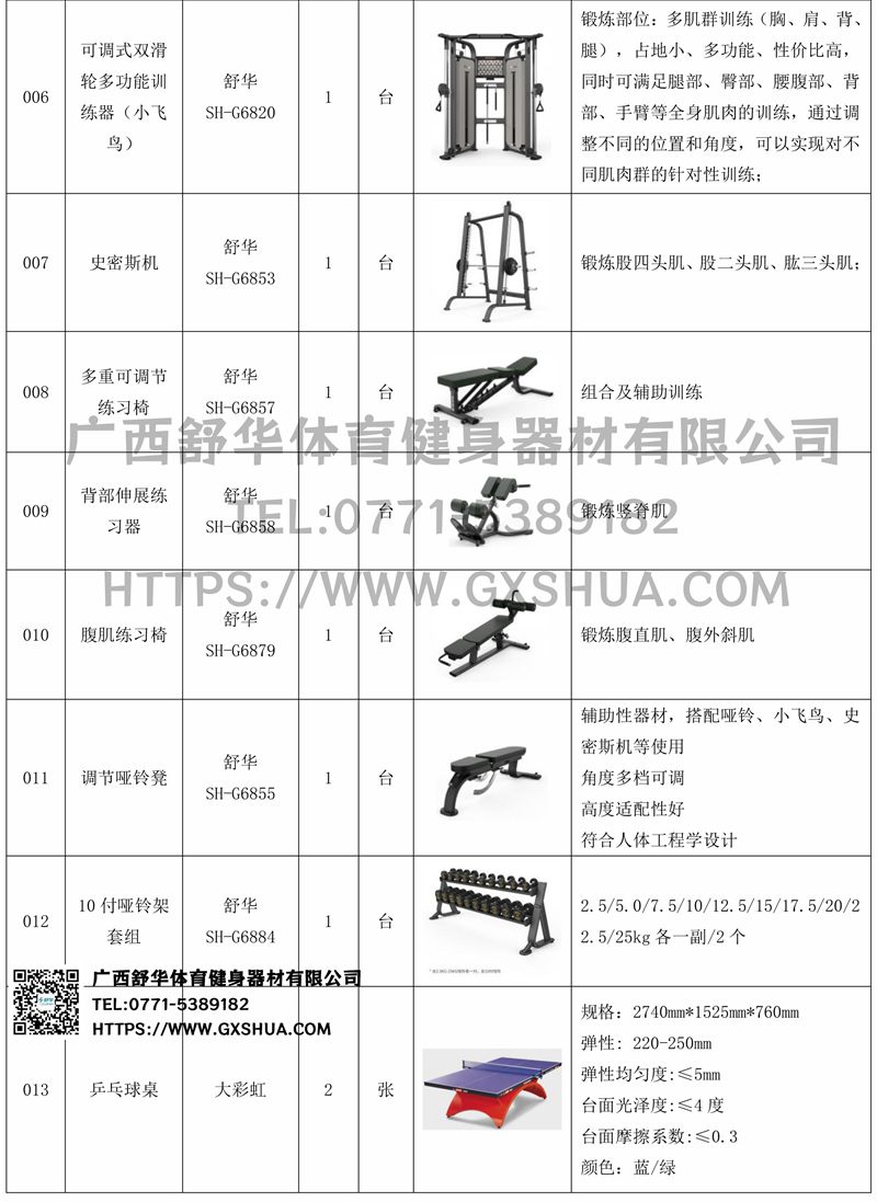 6.好博可调式双滑轮多功能训练器(小飞鸟)SH-G6820*1台-锻炼部位:多肌群训练(胸、肩、背、腿),占地小、多功能、性价比高,同时可满足腿部、臀部、腰腹部、背部、手臂等全身肌肉的训练,通过调整不同的位置和角度,可以实现对不同肌肉群的针对性训练;可搭配不同配件,拓展多种训练方法,提供针对性训练、多种组合等训练方式,全方位激活身体机能。