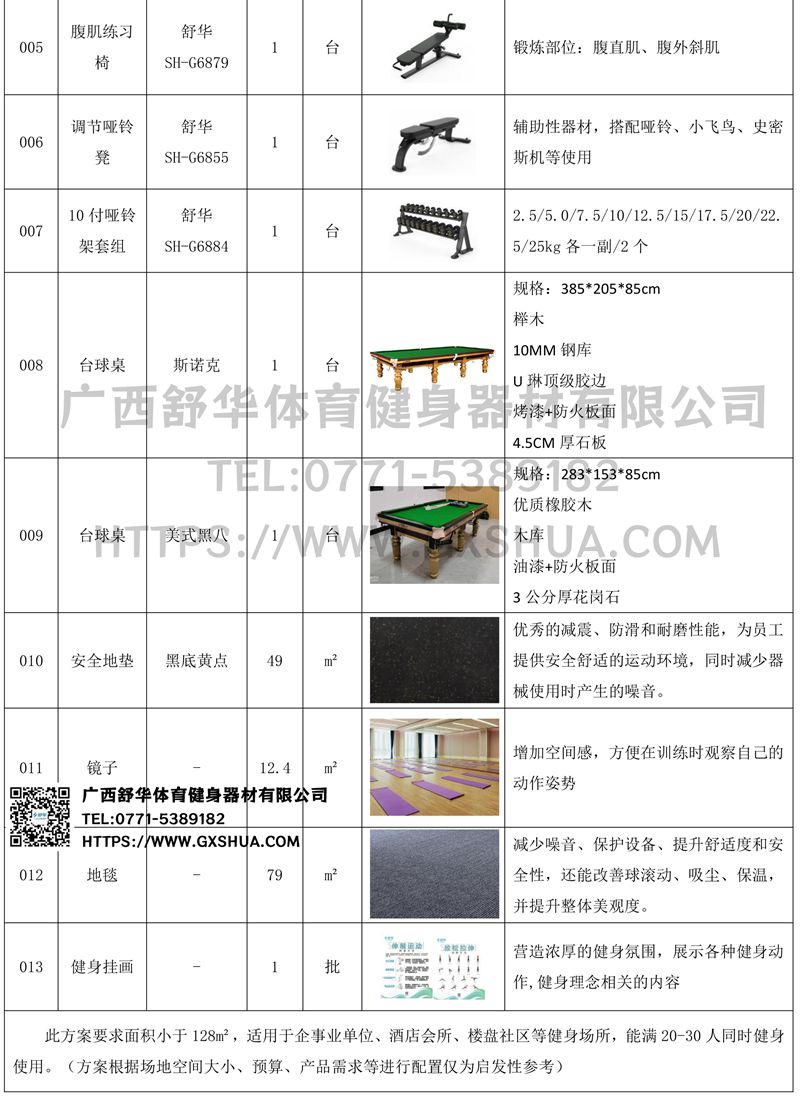 此方案要求面积小于128m²,适用于企事业单位、酒店会所、楼盘社区等健身场所,能满20-30人同时健身使用。(方案根据场地空间大小、预算、产品需求等进行配置仅为启发性参考)