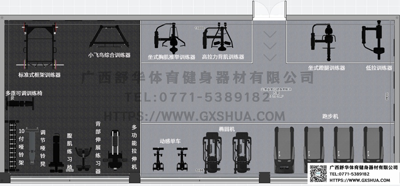 小飞鸟(1台)、标准式框架训练器(1台)、多重可调节练习椅(1台)、腹肌训练器(1台)、罗马椅、10付哑铃套组(1套)、可调哑铃凳(1台),可以实现对不同肌肉群的针对性训练,满足肌肉训练需求,全方位激活身体机能。