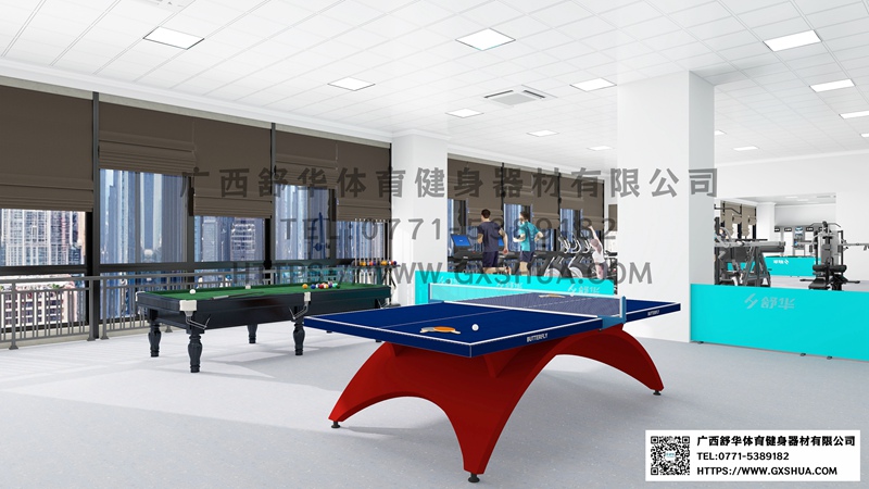 主要配置乒乓球桌(1张),台球桌(1张),乒乓球是全身运动,提升手眼协调和反应能力;台球则锻炼专注力和策略思维,帮助员工在紧张工作后放松身心,缓解压力,多人参与,促进员工互动,增进友谊和团队合作。