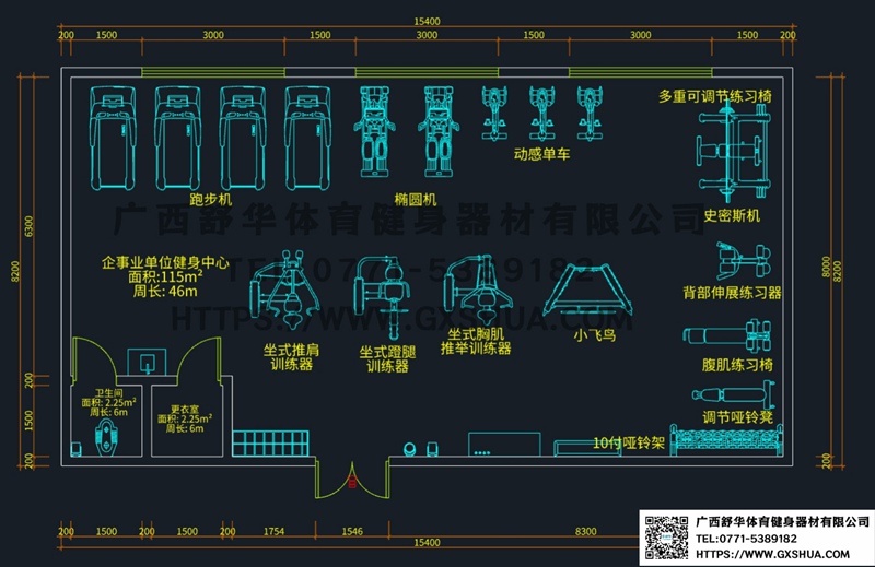 此方案要求面积小于115m²,适用于企事业单位、酒店会所、楼盘社区、工作室、学校等健身场所,能满15-20人同时健身使用。(方案根据场地空间大小、预算、产品需求等进行配置仅为启发性参考)