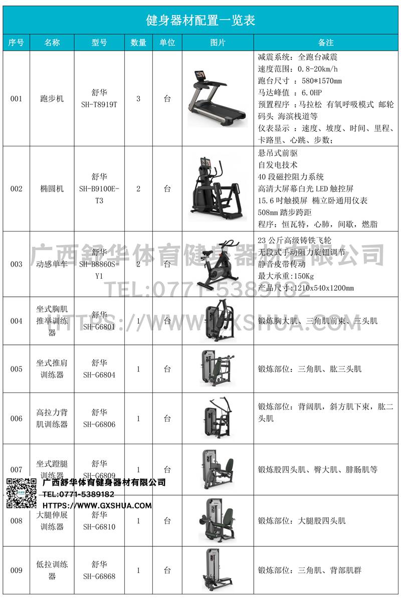 1.好博V9+跑步机SH-T8919T*3台-V9+采用全跑台减震设计,为跑者提供舒适的落脚地感和稳定的跑步支撑,良好的缓冲防护,降低膝关节受伤风险。商用大跑台,为跑者提供从容奔跑空间,180kg承载力,580*1570纯跑台面积,满足专业健身需求。V9+采用F级商用马达,6HP峰值马力,20km/h最高速度,提供源源不断的动力。