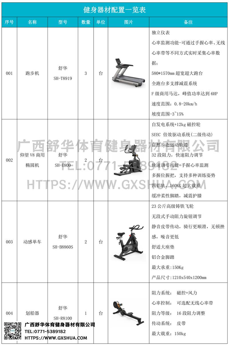 1.好博V9跑步机SH-T8919*3台-580*1570mm超宽超大跑台-跑感舒适,跑台整体安全稳定;全跑台多支撑减震平台,保证跑台超强支撑力,达到180kg支撑,满足专业健身房需求。F级商用马达-超强马达,AC 3.0HP 交流,峰值功率达到6HP,F级商用品质。速度范围达到0.8-20km/h;V9跑步机可实现跑台扬升功能,坡度范围-3~15%,满足客户不同的锻炼需求。